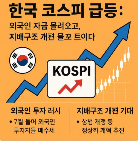 코스피가 여름 한복판에서 마치 축제를 방불케 하는 랠리를 이어가고 있습니다. 7월 들어 단 한 달 만에 약 14% 가까이 치솟으며, 전 세계 주요 지수 중 최고 상승률을 기록했는데요, 이 놀라운 기록 뒤에는 단연 외국인 투자자들의 ‘러시’가 자리하고 있습니다. 글로벌 펀드 매니저들이 ‘지금 아니면 기회 없다’며 한국 주식시장에 대거 자금을 투입한 덕분이지요.